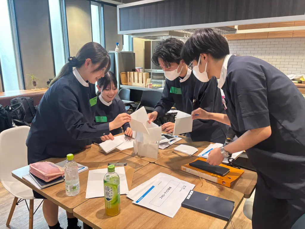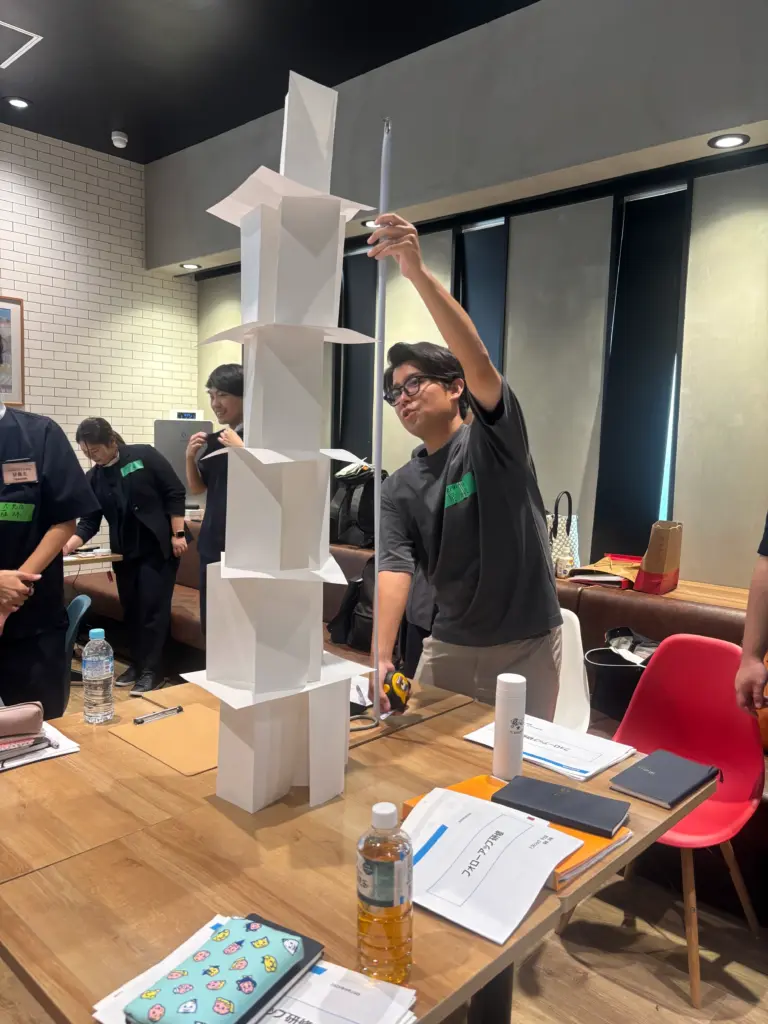 まずは自己紹介でお互いのことを知るところからスタート。最初は少し緊張した様子も見られましたが、アイスブレイクでペーパータワーを作り一緒に手を動かすうちに、笑顔や会話が増え、研修会場は明るく活気ある雰囲気になっていきました。